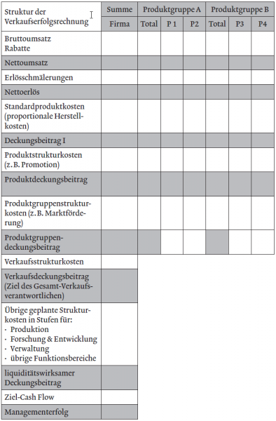 Sehr aussagekräftige Deckungsbeitragsstufen entstehen, wenn die gesamte Rechnung in Form der Verkaufserfolgsrechnung (VER) gestaltet wird. Diese ist die vermutlich häufigste Variante in der Praxis. Sie verfolgt das Ziel, den Erfolg und das Maß der Zielerreichung einer oder mehrerer Verkaufsorganisationen nach einzelnen Erfolgsquellen aufzuzeigen. Dazu müssen alle Veränderungen isoliert werden, die nicht auf vom Verkauf beeinflußbaren oder beobachtbaren Faktoren beruhen. Sie folgt also den Regeln der Entscheidungsrechnung und des Responsibility_accounting. Dafür werden in der VER die Produktkosten immer standardisiert, d.h. wie geplant - bei Auftragsfertigung wie bei der Auftragsannahme vorkalkuliert - von den Nettoerlösen abgezogen und die Strukturkosten der anderen Funktionsbereiche im Plan und im Ist immer als Planwerte aufgeführt. Abweichungen zwischen Soll und Ist, die nicht dem Verkauf zugeordnet werden können, schlagen somit auch nicht in die VER durch, sondern werden im Abweichungsresümee ausgewiesen.