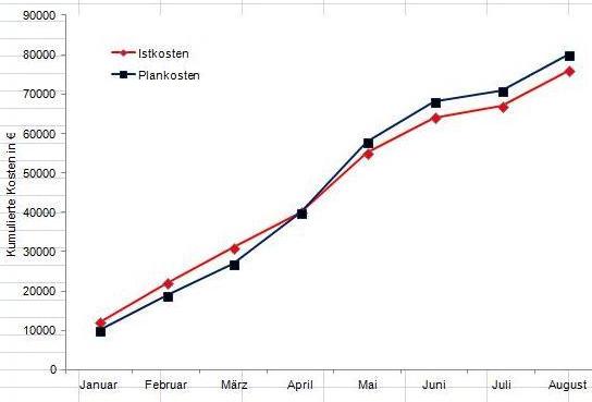 Abb. 2: Kumulierte Ist- und Plankosten nach 8 Monaten (Plandauer: 11 Monate)