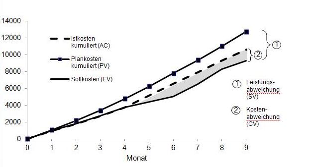 Eine Möglichkeit, den Leistungsstand in die Analyse mit einzubeziehen, ist der zusätzliche Ausweis von Sollkosten. Das sind diejenigen Kosten, die für eine gegebene Leistung planmäßig anfallen dürfen (Plankosten pro Leistungseinheit x Istleistung). Man spricht auch vom so genannten Earned Value. Die Earned Value Analyse ist eine aussagekräftige Methode zur integrierten Kosten- und Leistungskontrolle. Mit dieser Methode lassen sich zu einem bestimmten Stichtag folgende Fragen beantworten: