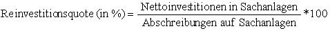 Die Reinvestitionsquote bietet Unternehmen die Möglichkeit, die übliche Investitionsquote, die die Nettoinvestitionen auf das Anlagevermögen zu Anschaffungs- oder Herstellungskosten bezieht, sachlogisch nachvollziehen zu können. Es wird das Investitionsverhalten des Unternehmens in Bezug auf den Ersatz alter Anlagen und den Aufbau neuer Produktionsmöglichkeiten beschrieben. Ein Wert über 1 deutet unter Ausschluss eventueller Preissteigerungen auf Wachstum durch Erweiterungsinvestitionen und/oder eine Positionsverbesserung durch Rationalisierungsinvestitionen hin. Fällt dagegen der Wert unter 1, so lässt sich auf eine Vernachlässigung von Ersatzinvestitionen schließen, was in der Zukunft zu höheren Reparaturaufwendungen, qualitativ veralteten Produkten und hohem Finanzierungsbedarf für später dringend erforderliche Ersatzanlagen führt. Es ist aber zu beachten, dass hier lediglich eine einperiodische Betrachtung erfolgt und somit bestimmte branchen- oder unternehmensbedingte Investitionszyklen nicht beachtet werden.