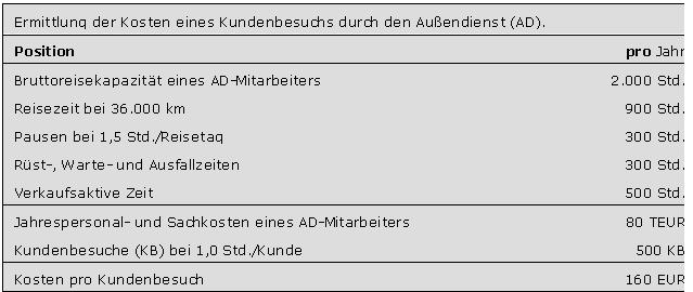 - Kundenbewertung durch Vertreterkosten-Analyse: Kunde ist bekanntlich nicht gleich Kunde, auch wenn beiden den gleichen Anteil am Umsatz Ihrer Firma haben. Verschaffen Sie sich einen Überblick darüber, wie "teuer" ein Kunde ist. Ein besonders gutes Instrument zur Beurteilung der Kundenqualität und damit auch zur Vertriebssteuerung liegt in der Ermittlung der Kosten eines Kundenbesuchs und der Besuchsfrequenz. Ein Kunde, der erst nach zehn Besuchen den gleichen Umsatz auslöst, der sich im allgemeinen schon nach zwei bis drei Besuchen erzielen läßt, ist längst kein guter Kunde mehr. Versuchen Sie, Ihre Kosten pro Vertreterbesuch zu ermitteln. Gehen Sie dabei nach folgendem Schema vor:
