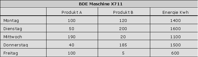 Aus einer solchen Tabelle kann der Kostenrechner nur sehr ungenau eine Verteilung der Energieverbräuche auf die Produkte A und B vornehmen. Wenn ein modernes Fertigungszentrum an einem Tag wesentlich mehr unterschiedliche Produkte bearbeitet, ist eine manuelle Zuordnung nicht mehr möglich. Eine digitale und eventuell vernetzte BDE liefert die Daten in kleineren Abständen, z. B. nach jedem Stück, und ermöglicht damit die exakte Zuordnung der Energiekosten zu den Kostenträgern.