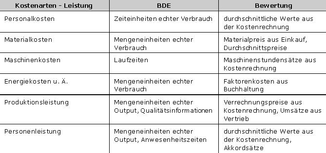 Die Betriebsdatenerfassung dient dazu, die anfallenden Kosten, Verbräuche und Leistungen festzuhalten und möglichst direkt den Verursachern zuzuordnen. Trotz der großen Datenmengen und der komplexen Zusammenhänge muss die Datenerfassung korrekt und aktuell sein. Die Wirtschaftlichkeit spielt eine wichtige Rolle. Nicht immer ist es sinnvoll, das technisch Machbare auch umzusetzen. So hat z. B. die exakte Zuordnung der Energieverbräuche einer Maschine zu den dort produzierten Produkten dann keinen Sinn, wenn die Produkte sehr homogen sind. Mit Durchschnitten erhält der Kostenrechner in diesem Fall ausreichend gute Ergebnisse. Die BDE erfasst keine Geldwerte, sondern Größenordnungen und Einheiten, die später in der Kostenrechnung bewertet werden. Je nach Anwendung werden Geldgrößen gar nicht benötigt. Das ist dann der Fall, wenn der Verantwortliche auf den Verbrauch von Material Einfluss nehmen kann, nicht aber auf den Einkaufspreis.
