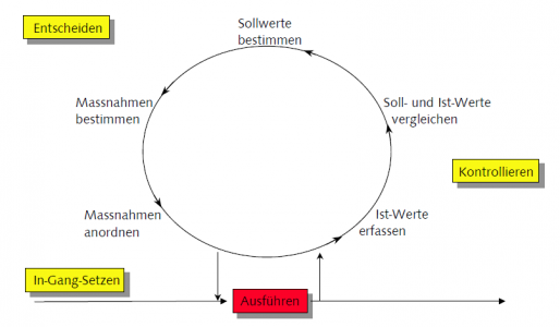 Sind Ziele und Massnahmen bekannt, wird die Ausführung in Gang gesetzt, d.h. die Führungskraft gibt Anordnungen. Diese Anordnungen führen dazu, dass in der nächsten Stufe eine ausführende Tätigkeit angefangen wird oder dass der Führungskreislauf auf der nächsten Stufe in der beschriebenen Weise neu gestartet wird. Da das Ist, d.h. die Ausführung, selten genauso eintrifft, wie geplant, ergibt sich die Notwendigkeit, das Geschehene zu messen und mit dem Ziel zu vergleichen. Störungen, die man in der Planung nicht voraussehen konnte, treten immer wieder ein und verhindern oder verunmöglichen die Erreichung der angestrebten Resultate. Die Führungskraft, die eine Differenz zwischen Ziel und Ist feststellt, hat drei grundlegende Handlungsmöglichkeiten:
