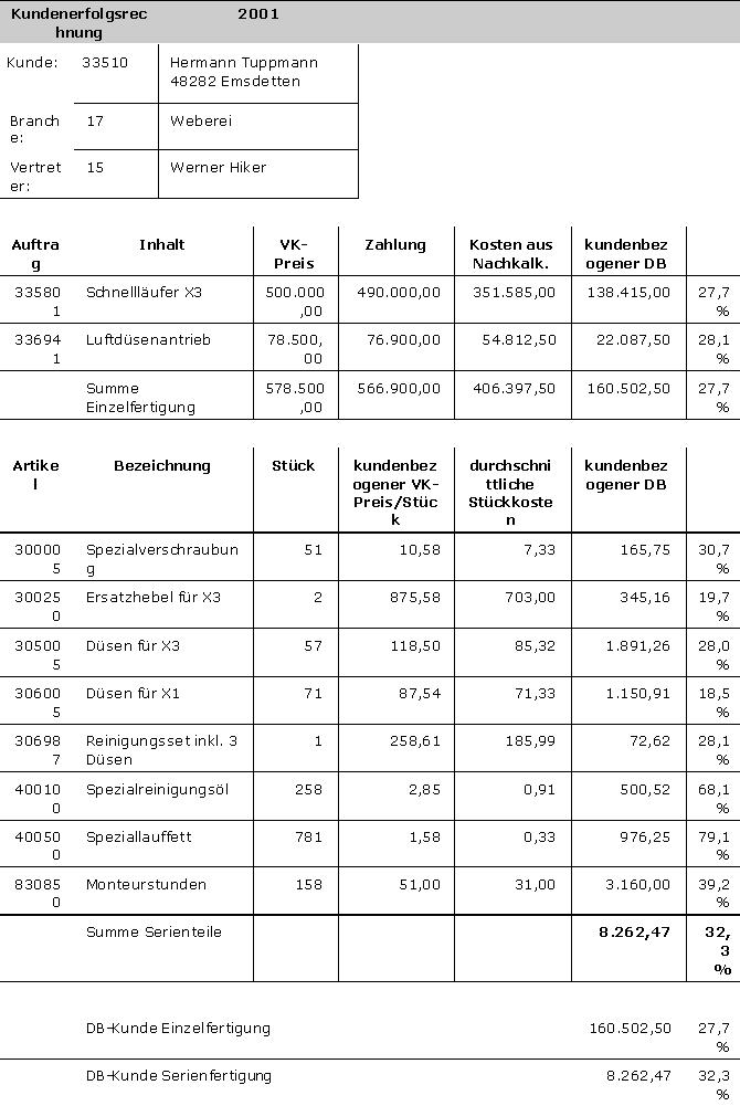 Unternehmen, die für jeden Kunden Einzelaufträge erledigen (Bauindustrie, Individualmaschinenbau, Beratung etc.), können durch die einfache Nachkalkulation der Aufträge auch den Deckungsbeitrag des Kunden ermitteln. Die Werte der einzelnen Aufträge eines Kunden werden addiert. Damit ergibt sich der Wert, den der Kunde zum Ergebnis des Unternehmens beigetragen hat.