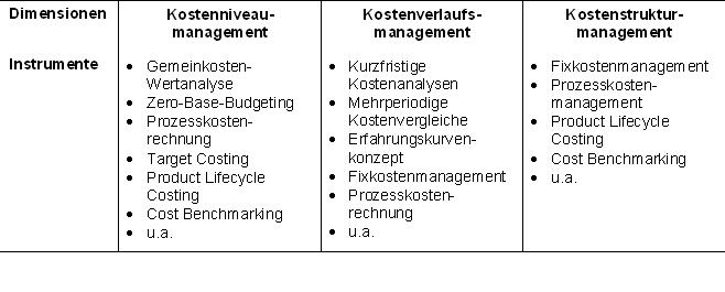 Das Kostenmanagement kann auf unterschiedliche Instrumente zurückgreifen, die in Abhängigkeit des Bezugsobjekts und der Kostenmanagementkategorie ausgewählt werden müssen. Weiter Aspekte die berücksichtig werden müssen sind die Ebene, auf der die Kostenbeeinflussung stattfinden soll, der Grad der Veränderung, der geplanten Anwendung sowie der Produktlebenszyklusphase. Einige Methoden und Verfahren können in mehreren Bereichen eingesetzt werden. Abbildung 2 bietet eine Übersicht möglicher Instrumente des Kostenmanagements.